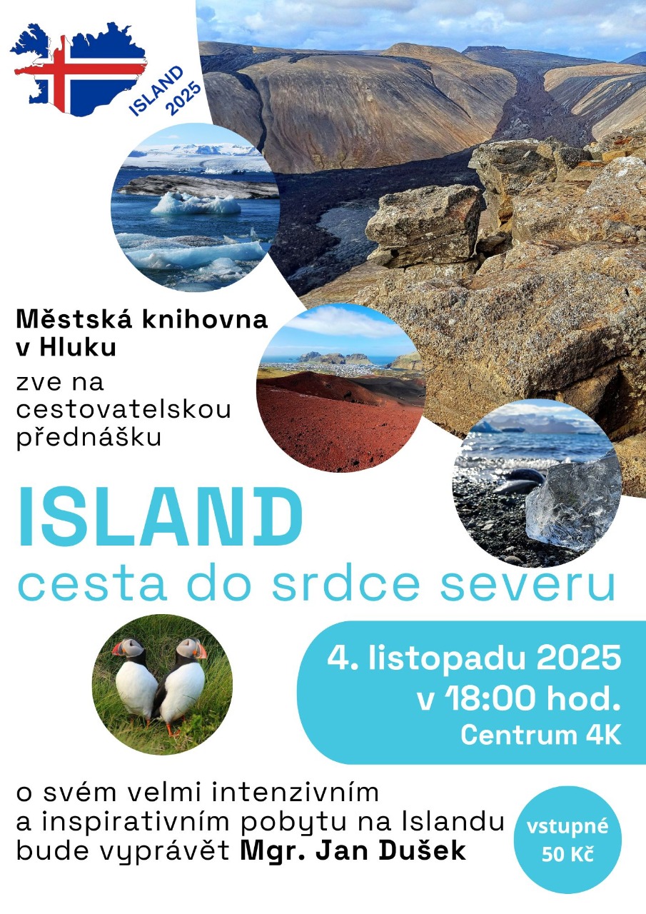 Přednáška se uskuteční v úterý 4. listopadu 2025 od 18 hodin v Centru 4K. O svém pobytu na Islandu bude vyprávět Mgr. Jan Dušek z Uh. Hradiště.