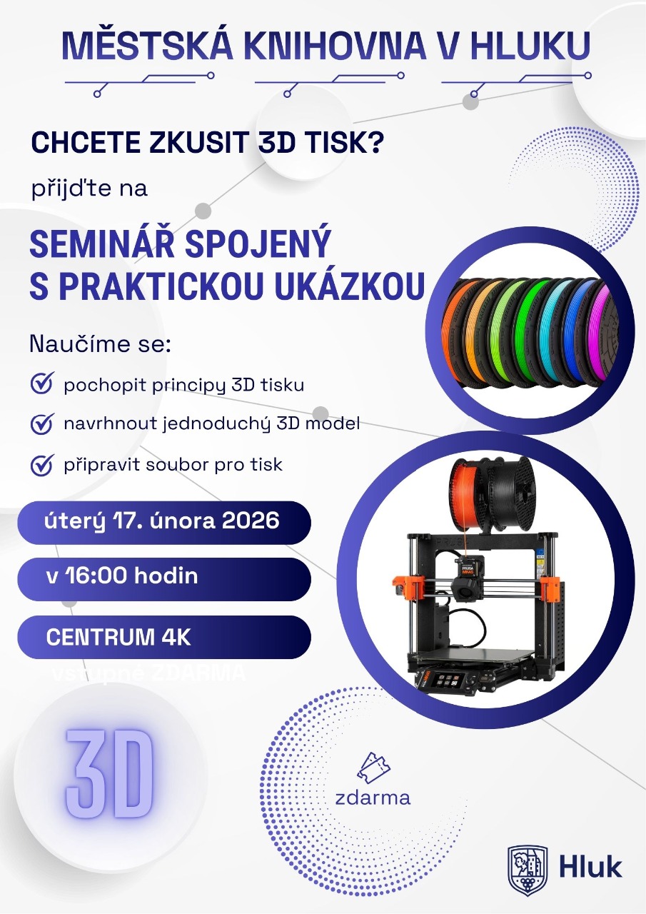 Zveme vás na seminář, na kterém pochopíme principy 3D tisku, navrhneme jednoduchý 3D model a připravíme soubor pro tisk.